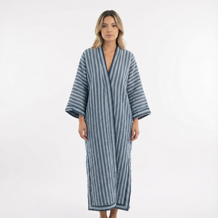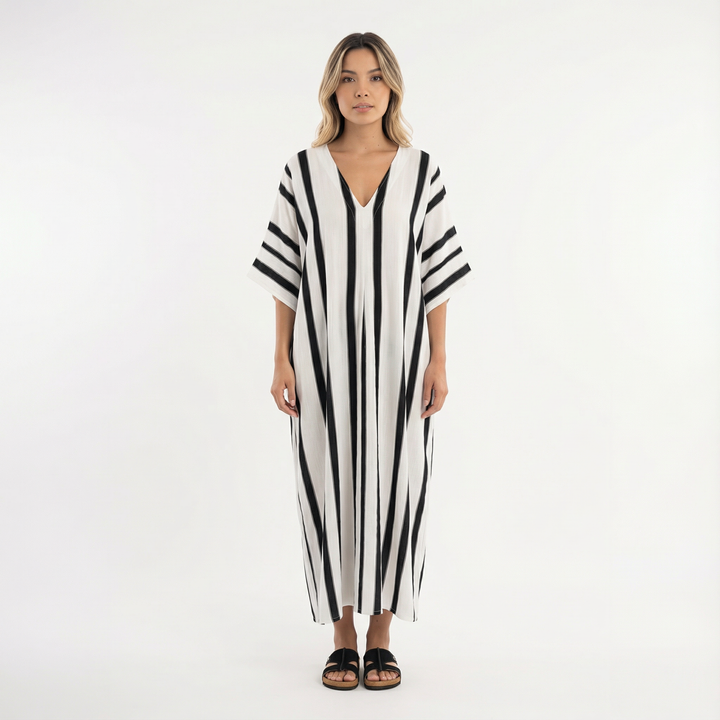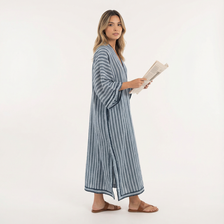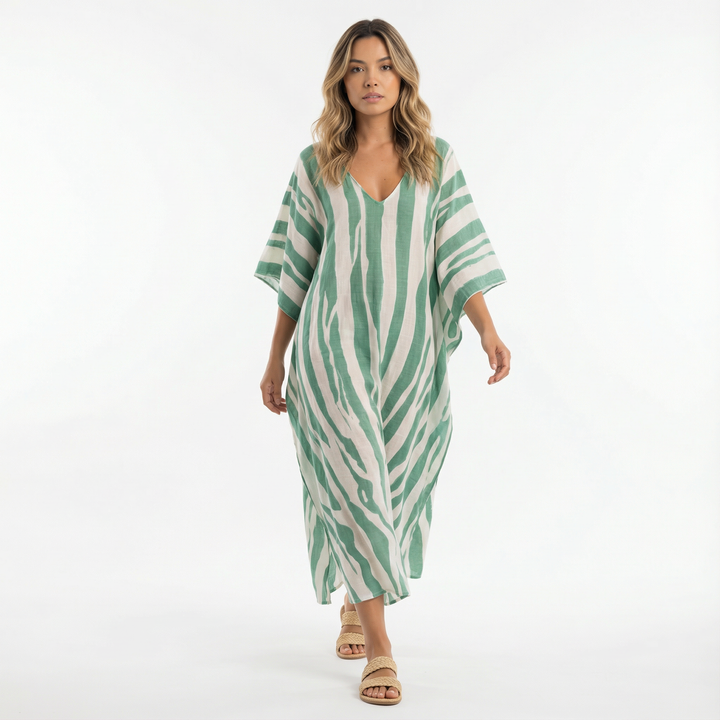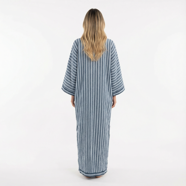 Este vestido largo destaca por su silueta amplia y su tejido ligero, ofreciendo una sensación de comodidad y elegancia sin esfuerzo. Su diseño relajado se adapta suavemente al cuerpo, creando un look favorecedor ideal para días cálidos, paseos tranquilos o momentos especiales con un aire sofisticado.