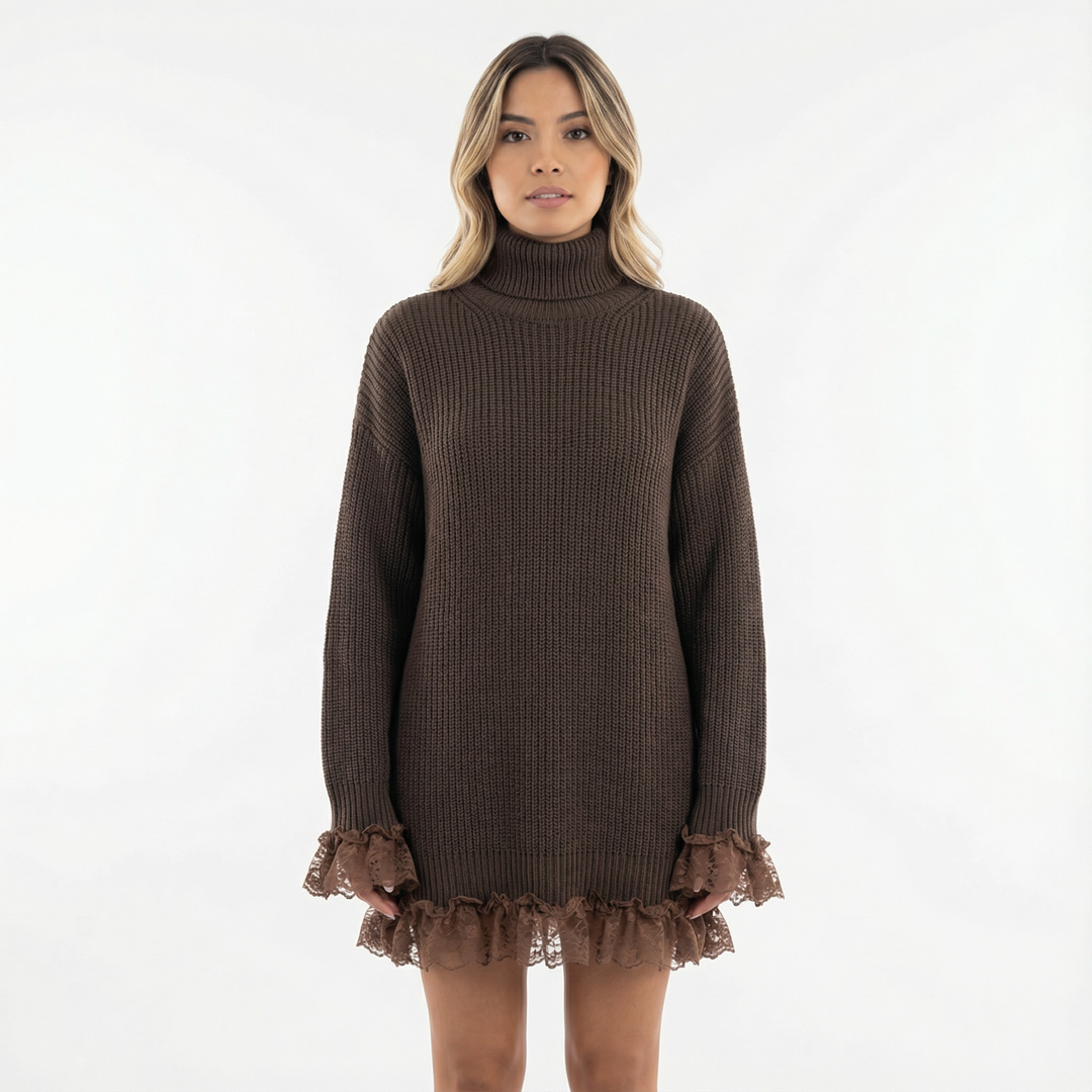 Vestido de Encaje con Mangas Abullonadas y Cuello Alto