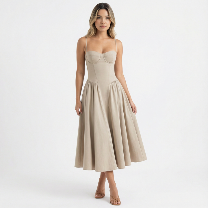 Este vestido midi tipo corsé combina sofisticación y funcionalidad en una silueta refinada que realza la figura con naturalidad. Su cuerpo entallado y los tirantes ajustables ofrecen un ajuste favorecedor y cómodo, ideal para adaptarse a diferentes ocasiones, desde planes informales hasta eventos más formales.