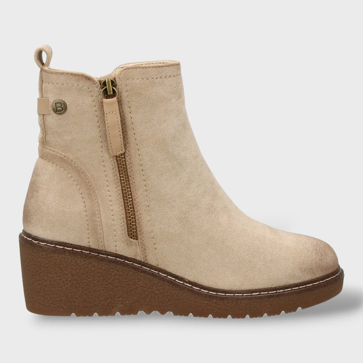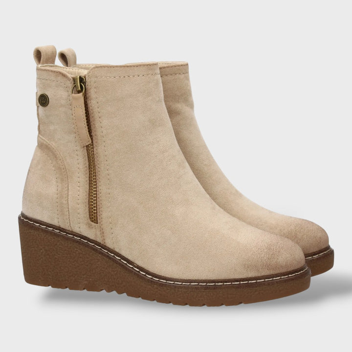 Estos botines de cuña media combinan diseño elegante y confort excepcional. Con cierre de cremallera lateral y cuña de 5,5 cm, ofrecen el equilibrio perfecto entre altura y estabilidad, ideales para acompañarte durante todo el día sin esfuerzo. Su acabado cuidado y materiales de alta calidad aportan sofisticación a cualquier look.